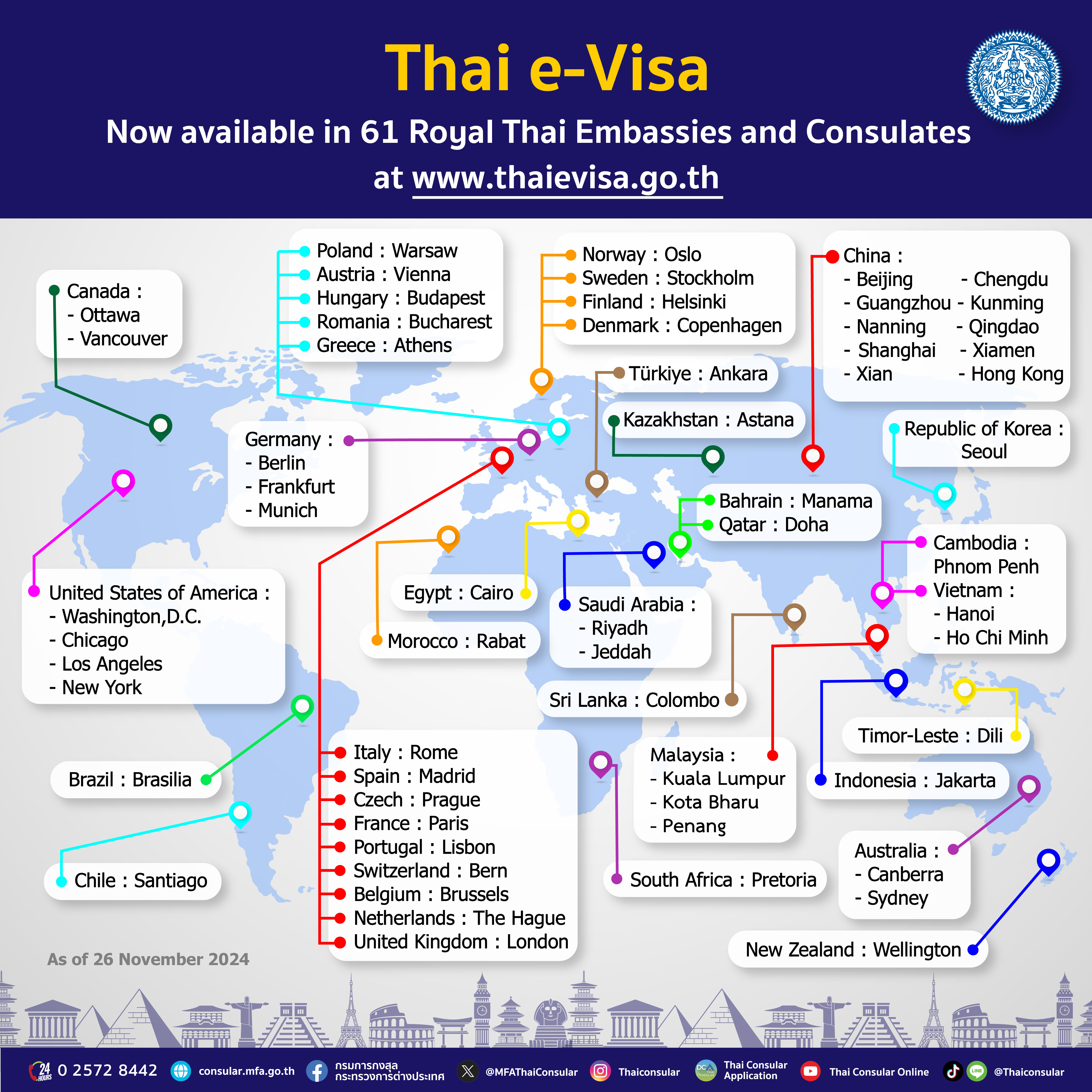 Announcement: Thailand’s e-Visa services is now available at 61 Embassies and Consulates-General. Foreign applicants with current location in the areas covered by these Embassies and Consulates-General can apply for e-Visa at : www.thaievisa.go.th